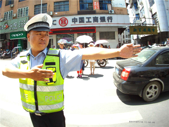 福建法治报-海峡法治在线9月21日讯 在“平安南平”6号专项行动中,根据顺昌县交通管理的特点,顺昌县公安局交警大队全警出动,深入辖区的高速、国道和城区等道一线,维护交通秩序,纠正交通违章,与出行的群众一起接受安全的考验。图为交警冒高温在城区街道引导群众出行。