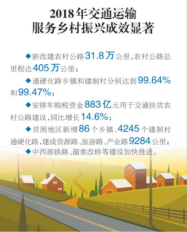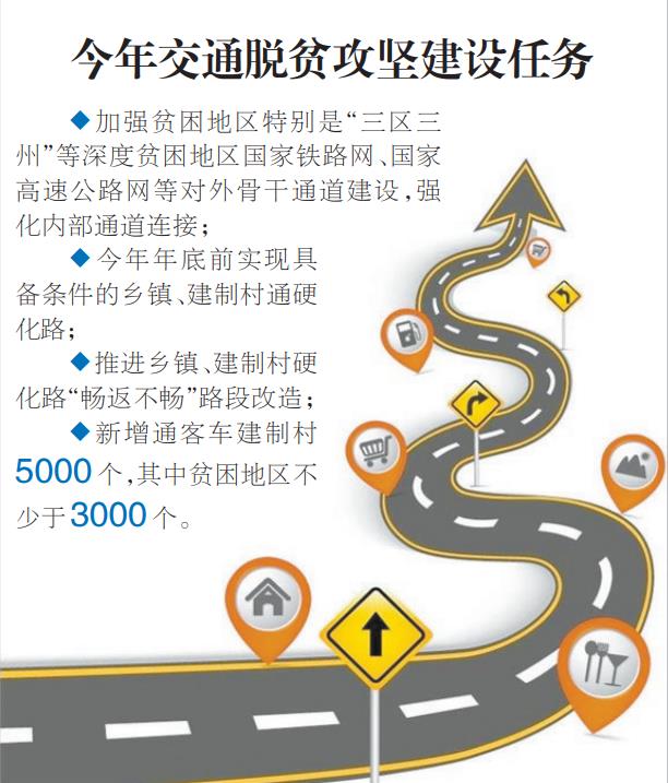 今年,我们将着眼于全面小康和乡村振兴,继续打好交通脱贫攻坚战。坚持把精准方略贯穿始终,以进村入户为主攻方向,以贫困地区为主攻对象,以服务产业为主要切入点,加快改善贫困地区交通面貌,在全面小康路上,绝不让任何一名群众因交通而掉队。发挥好交通对乡村振兴和脱贫攻坚的支撑作用。今年计划新建“四好农村路”2.4万公里,启动普通干线公路改造3300公里,力争18个深度贫困乡镇对外通道全部开工、通组公路全部完工。
