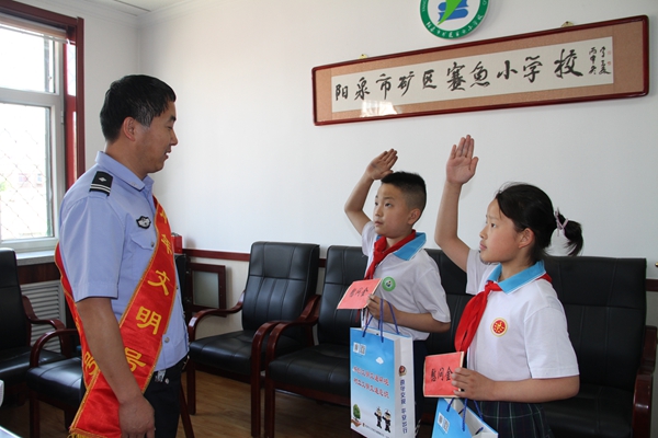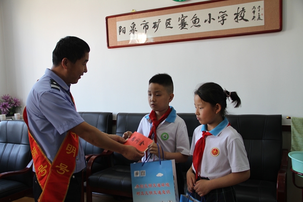 在“六一”国际儿童节到来之际,5月28日下午阳泉交警一大队团支部来到阳泉市矿区赛鱼小学开展“送温暖、献爱心”慰问活动,给两位贫困学生送去慰问金,同时,向孩子们送上节日的祝福。