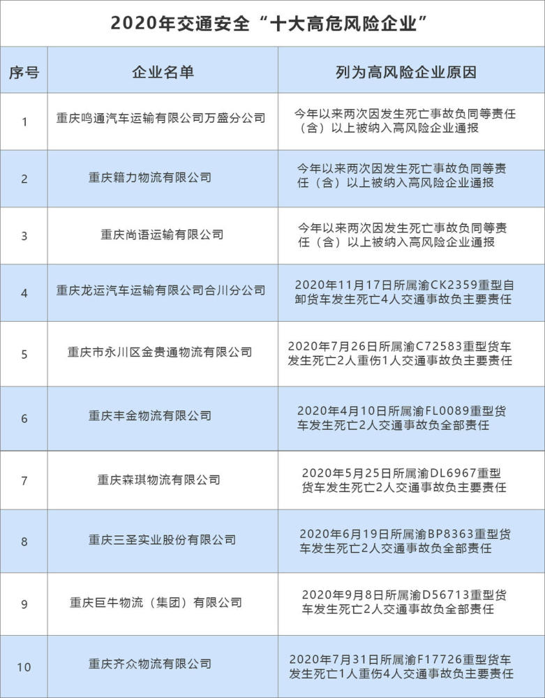 1月3日,封面新闻记者从重庆市公安局交巡警总队获悉,为全力预防和减少道路交通事故,交巡警总队在重庆全市范围内开展运输企业交通安全隐患排查整治,并向社会公布2020年重庆市交通安全“十大高危风险运输企业”。