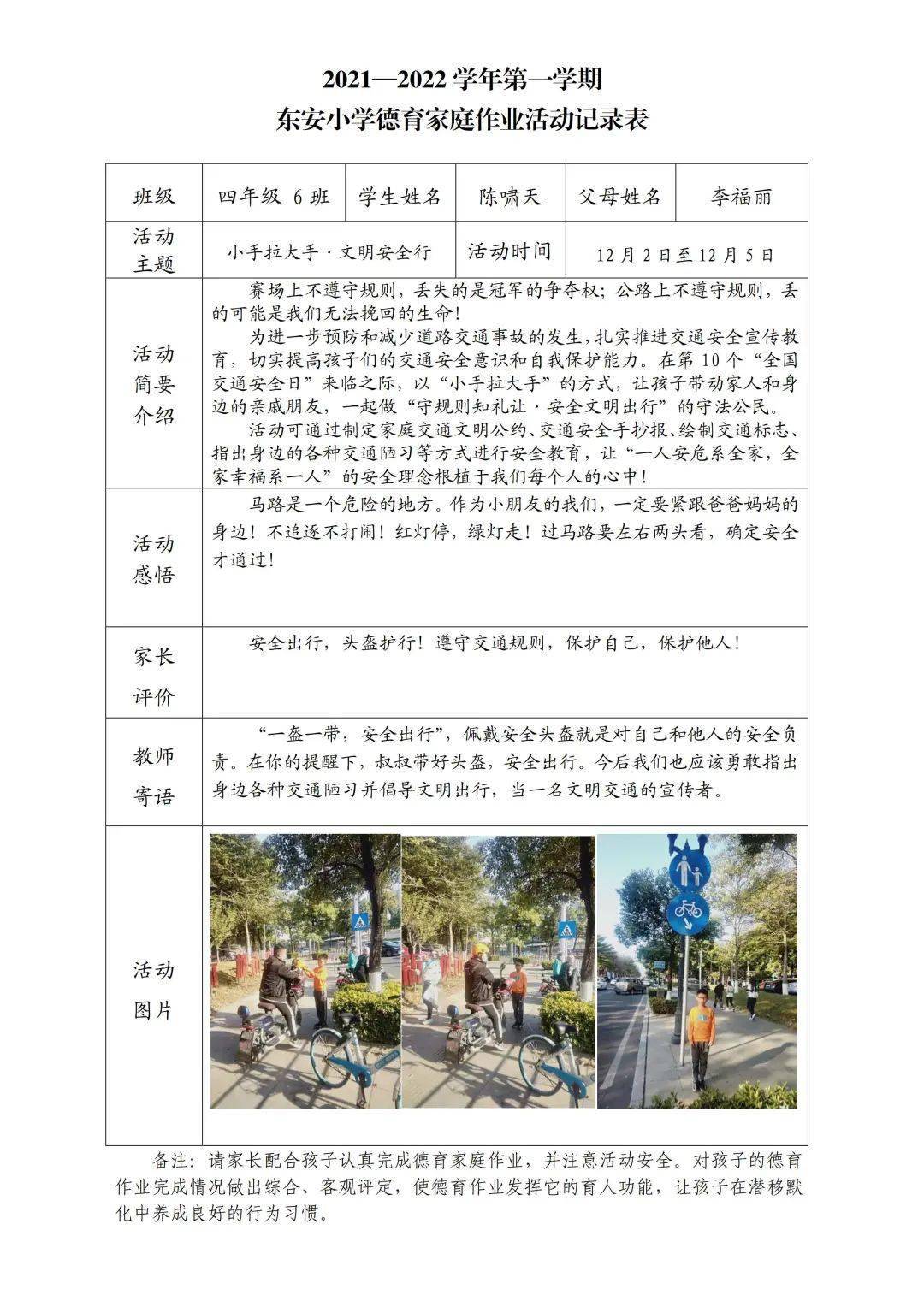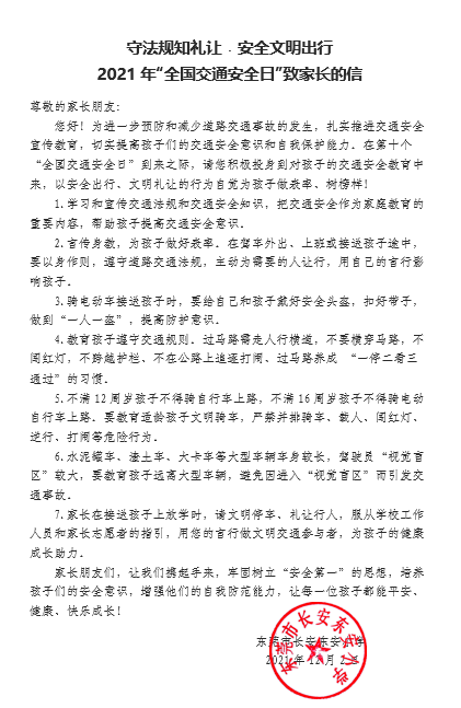 守法规知礼让 安全文明出行 东安小学开展交通安全知识教育 专题活动 活 动 一 交通安全日来临之际,我校特开展了“文明交通安全行”主题黑板报宣传活动。通过板报的宣传,让学生详细了解交通安全知识和明白安全的重要性,不要去做违反交通安全规则的事情。 活 动 二 学校通过班级微信群向每一位家长推送了“守法规知礼让,安全文明出行”致家长的一封信。通过家校携手,牢固树立“安全第一”的思想,培养孩子们的安全意识,增强他们的自我防范能力,让每一个孩子都能平安、健康、快乐成长! 活 动 三 全国第十个交通安全日来临之际,学校推出“大手拉小手,文明安全行”的第四期德育家庭作业。孩子们通过制定家庭交通文明公约、交通安全手抄报、绘制交通标志、指出身边的各种交通陋习,让“一人安危系全家,全家幸福系一人”的安全理念根植于我们每个人的心中!家长结合孩子们本次实践活动的收获与感悟,协助孩子们精心完成了活动记录表,老师还在记录表上写下对孩子的寄语。 这一系列交通安全活动,充实了学校安全教育内容,帮助师生更全面深刻了解交通安全法规的自觉性,对保障个人的交通安全、维护校内外交通安全秩序、争创平安校园起到积极的推动作用。珍爱生命,共创平安大道,让我们一起共筑文明交通,齐建安全家园。 责任编辑:棉棉 |